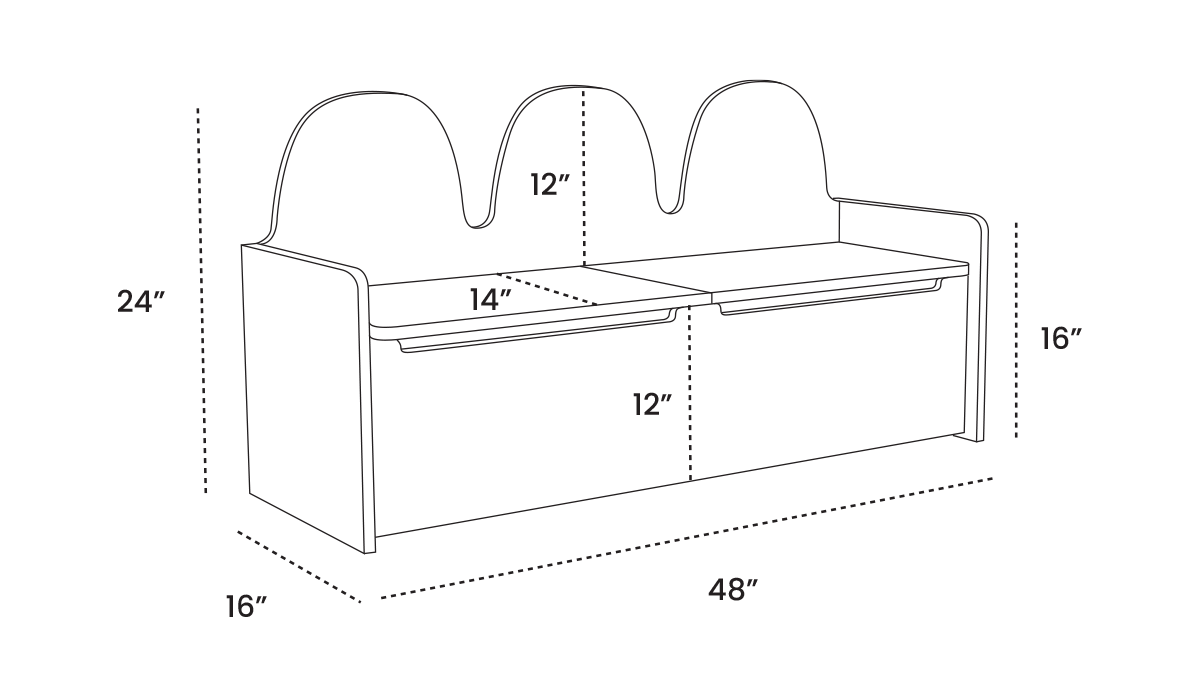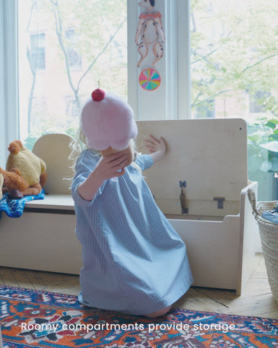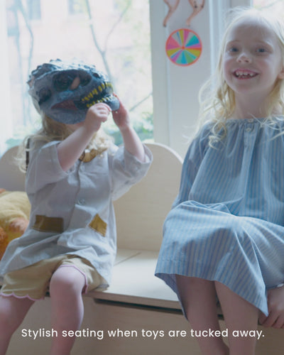 Storage meets seating in our clever Camel Storage Bench. Designed with little hands in mind, its soft-close lids stop just before closing, requiring a gentle push to shut fully for ultimate safety. Inside, two roomy compartments provide ample space for storing toys, games, costumes, or other essentials.